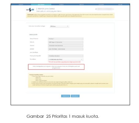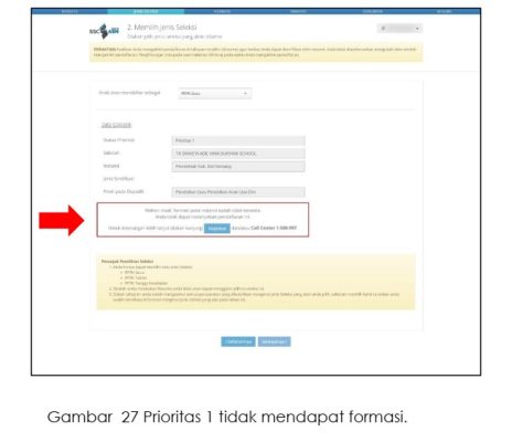 1. Jika pelamar masuk dalam kategori prioritas 1 namun tidak mendapatkan kuota penempatan maka pada saat pemilihan jenis seleksi, sistem akan menampilkan data pada DAPODIK pelamar sistem akan memberikan keterangan “Mohon maaf, formasi pada instansi sudah tidak tersedia. Anda tidak dapat melanjutkan pendaftaran ini.”
