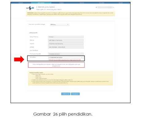 2. Kemudian pelamar mengisi pendidikan palmar pada kolom pendidikan. Pilih salah satu pendidikan yang paling sesuai dengan yang Anda miliki. Kemudian klik tombol selanjutnya. Jika pelamar tidak mengisi kolom pendidikan maka tombol selanjutnya tidak akan aktif (disable).