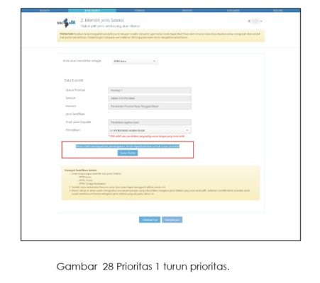 4. Jika pelamar merupakan pelamar Prioritas 1 namun tidak mendapatkan penempatan, pelamar dapat memilih untuk turun prioritas. pada saat pemilihan jenis seleksi, sistem akan menampilkan data pada DAPODIK pelamar sistem akan memberikan keterangan “Anda tidak mendapatkan penempatan, Anda boleh untuk turun prioritas.”