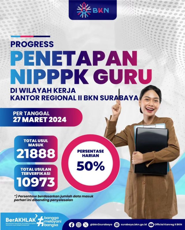 PUSTAKAGURU.ID – Progress penetapan NIPPPK Guru menjadi salah satu perkembangan yang paling ditunggu oleh calon ASN PPPK Guru di lingkungan Wilayah Kerja Regional II BKN Surabaya. Hal tersebut karena akan berpengaruh terkait SK yang akan diterima. Per tanggal 27 Maret 2024 persentase harian pada Wilayah Kerja Regional II BKN Surabaya telah mencapai 50%. Total usul masuk sejumlah 21.8888 dan total usulan terverifikasi sebesar 10.973.